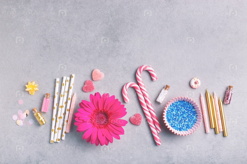 Розовый цветок, свечи на день рождения, конфеты и праздничное украшение на сером фоне