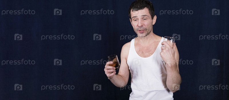 В комнате на темном фоне стоит одинокий и пьяный мужчина средних лет в белой домашней майке. В руках держит фужер и бокал с алкогольными напитками. Смотрит чуть в сторону от камеры и что-то кому-то говорит (объясняет)