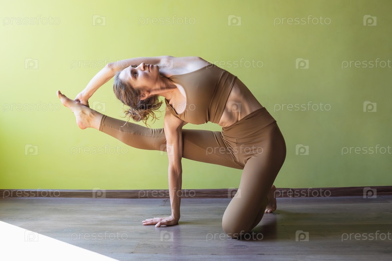 Молодая женщина практикует йогу, делает упражнения Ардха Вишвамитрасана, поза мудреца, тренируется в спортивной одежде в комнате у стены