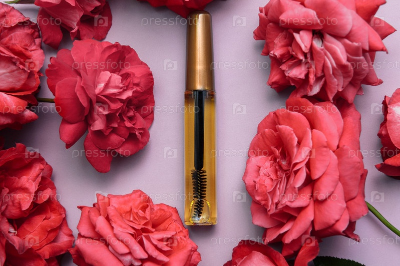 Бутылка масла для ресниц и бровей с черной кистью и золотой крышкой на розовом фоне с красными розами, плоская композиция, концепция ухода за бровями и ресницами, восстановление