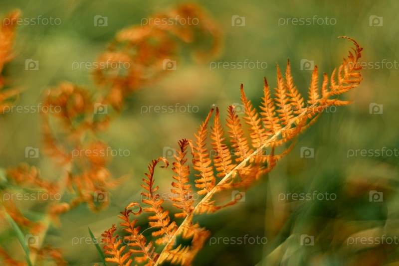 Пожелтевший лист папоротника на размытом фоне. Сухой лист папоротника в лесу. Осенний тропический фон