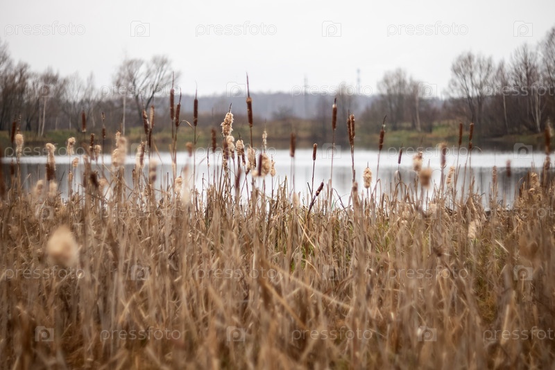 В озере растут сухие рогозы
