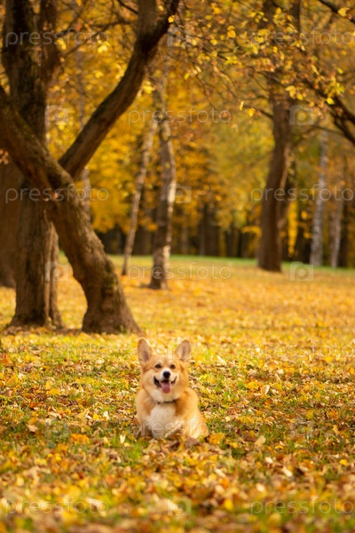 Корги в осеннем парке на фоне опавших золотых листьев