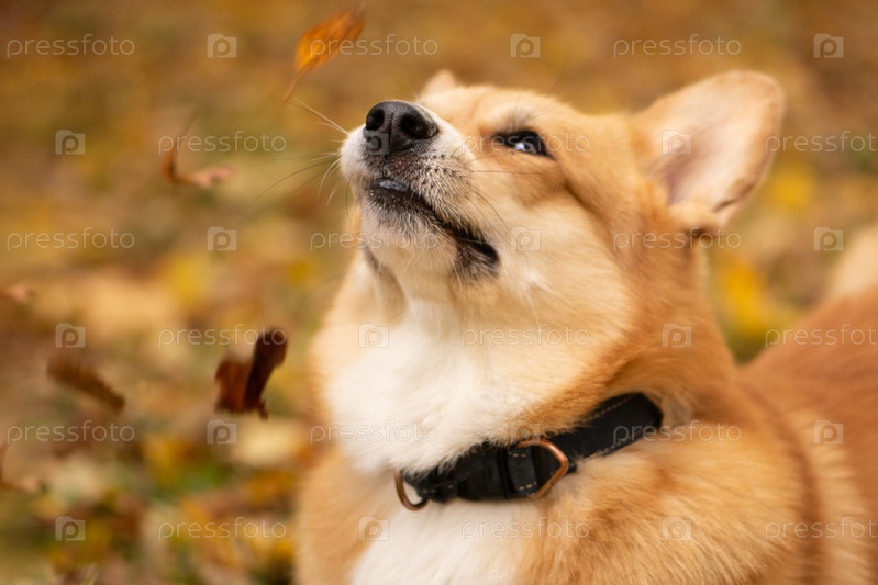 Милейший рыжеволосый вельш-корги Пемброк корчит рожицу и нюхает опавшие золотые листья