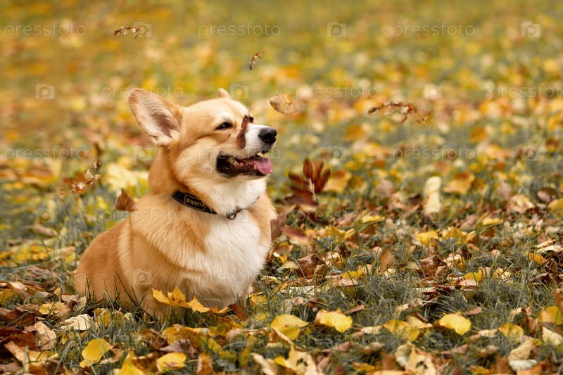 Корги в осеннем парке на фоне опавших золотых листьев