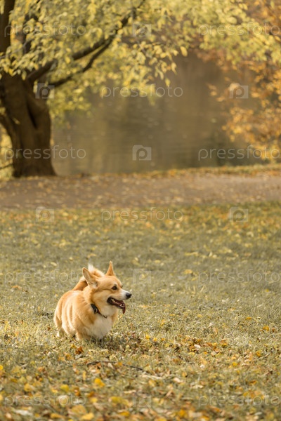 Самый милый рыжеволосый корги гуляет в осеннем парке среди опавших золотых листьев
