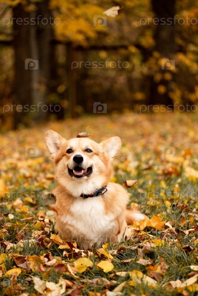 Собака корги играет с опавшими листьями в осеннем парке