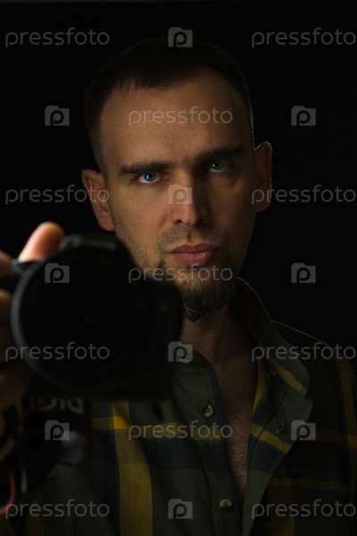 Нагрудный портрет фотографа на черном фоне. Бородатый мужчина в зеленой клетчатой рубашке держит камеру в протянутой руке и смотрит в камеру. Низкий ключ