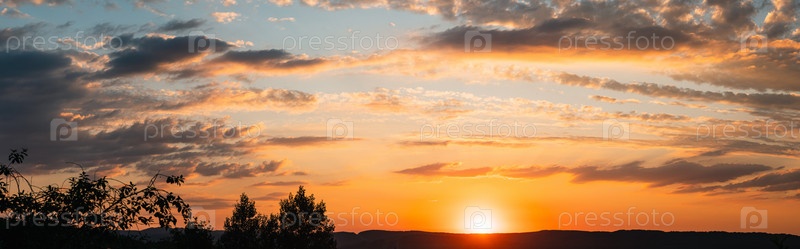 Летний закат в желтых и оранжевых тонах. Солнечные лучи снизу освещают темные тучи. Силуэты деревьев на переднем плане и силуэт горного хребта на заднем плане