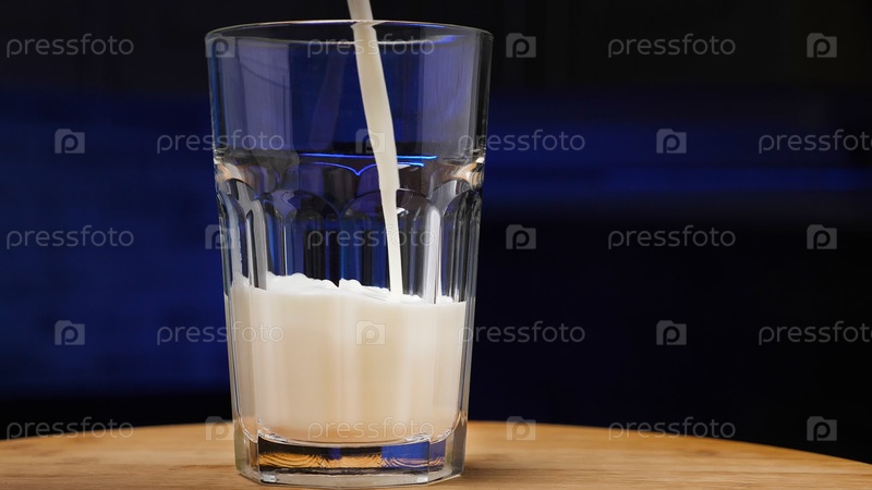 Наливание молока в стакан. Стакан молока на деревянном подносе. Темно-синий фон. Понятие о молочных продуктах