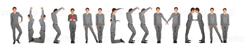 Слово бизнесмен, составленное молодым человеком на белом фоне, коллаж