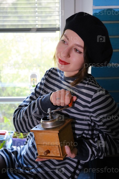 Девушка мелет кофе