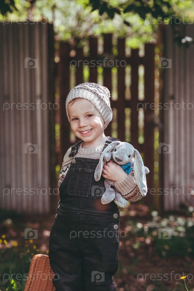 Маленький мальчик 4 лет на улице с чемоданом и плюшевым кроликом отправляется в путешествие. Красивый портрет ребенка, играющего на улице