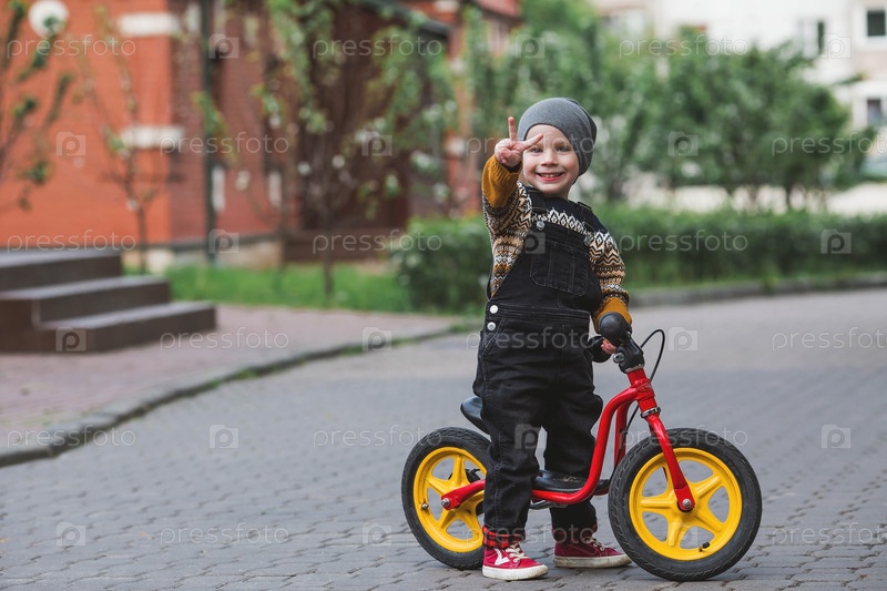 Веселый маленький мальчик катается на велосипеде на улице. Счастливый ребенок гуляет в весеннем парке. Малыш одет в модный свитер и джинсовый комбинезон
