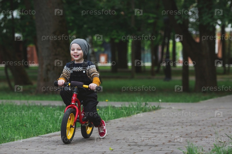 Веселый маленький мальчик катается на велосипеде на улице. Счастливый ребенок гуляет в весеннем парке. Малыш одет в модный свитер и джинсовый комбинезон