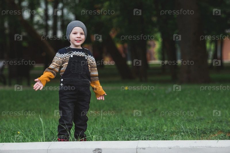 Портрет модного маленького мальчика на открытом воздухе. Счастливый ребенок гуляет в весеннем парке. Малыш одет в модный свитер, кроссовки и джинсовый комбинезон