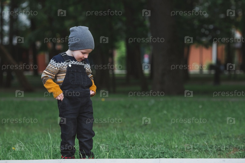 Портрет модного маленького мальчика на открытом воздухе. Счастливый ребенок гуляет в весеннем парке. Малыш одет в модный свитер, кроссовки и джинсовый комбинезон