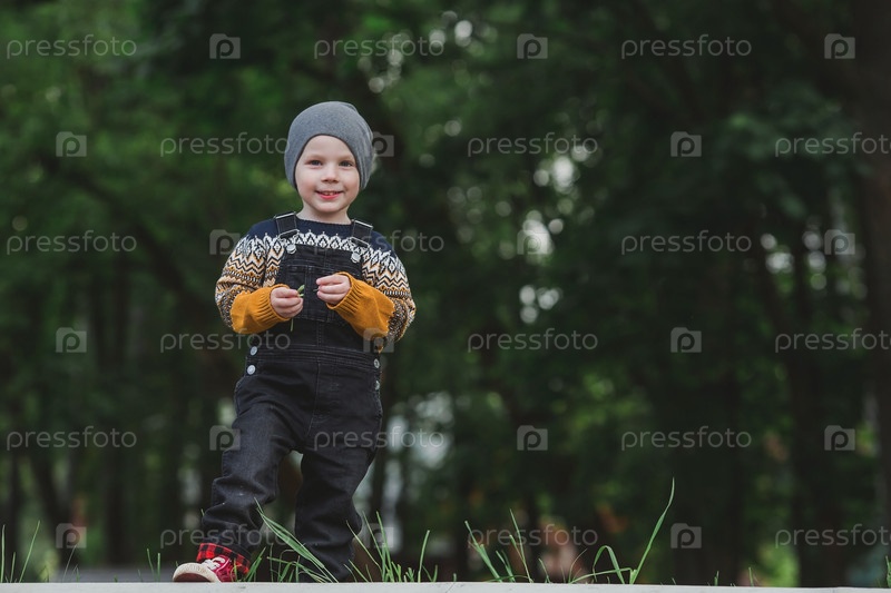 Портрет модного маленького мальчика на открытом воздухе. Счастливый ребенок гуляет в весеннем парке. Малыш одет в модный свитер, кроссовки и джинсовый комбинезон