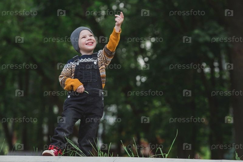 Портрет модного маленького мальчика на открытом воздухе. Счастливый ребенок гуляет в весеннем парке. Малыш одет в модный свитер, кроссовки и джинсовый комбинезон