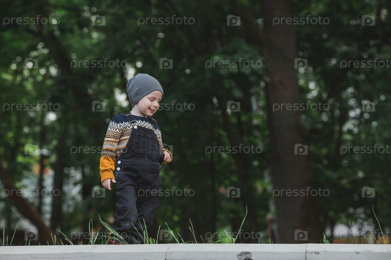 Портрет модного маленького мальчика на открытом воздухе. Счастливый ребенок гуляет в весеннем парке. Малыш одет в модный свитер, кроссовки и джинсовый комбинезон