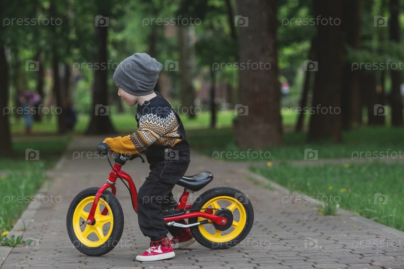 Веселый маленький мальчик катается на велосипеде на улице. Счастливый ребенок гуляет в весеннем парке. Малыш одет в модный свитер и джинсовый комбинезон