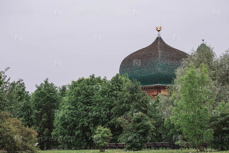 Городской ландшафт. Популярная туристическая достопримечательность. Визитная карточка Москвы. Деревянный дворец царя Алексея Михайловича в Коломенском. Россия, Москва, май 2023 г
