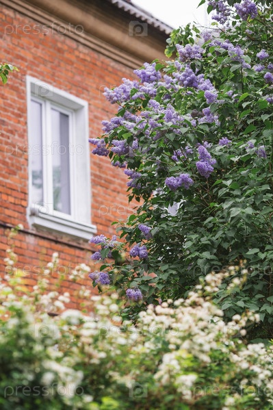 Пушистая, цветущая сирень у дома под окном. Красивый цветочный фон. Крупные гроздья сирени