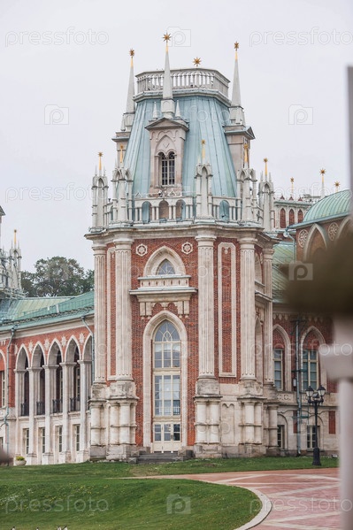 Россия. Большой дворец в Царицынском парке. Царицынский парк — одна из главных туристических достопримечательностей Москвы. Детали дворца. Крупный план