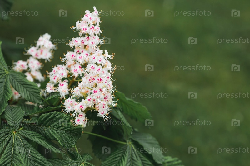 Ветки и цветы каштана. Цветущее дерево весной. Крупный план. Фон из цветов и листьев. Цветущий каштан