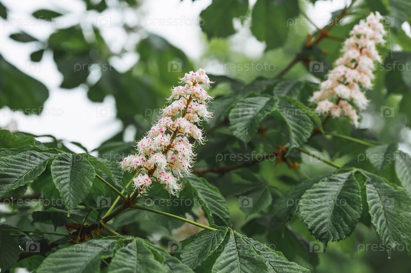 Ветки и цветы каштана. Цветущее дерево весной. Крупный план. Фон из цветов и листьев. Цветущий каштан