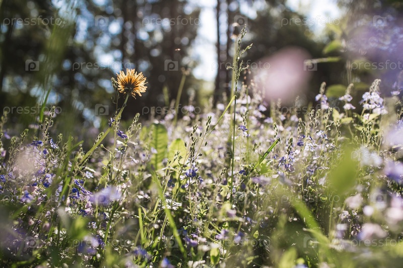 Красивый естественный фон. Раннее утро в лесу с бликами от солнца. Полевые цветы Васильковая фармакопея и одуванчики на солнце