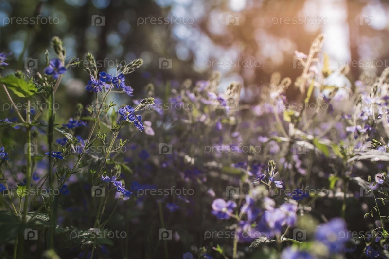Красивый естественный фон. Раннее утро в лесу с бликами от солнца. Полевые цветы Васильковая фармакопея и одуванчики на солнце
