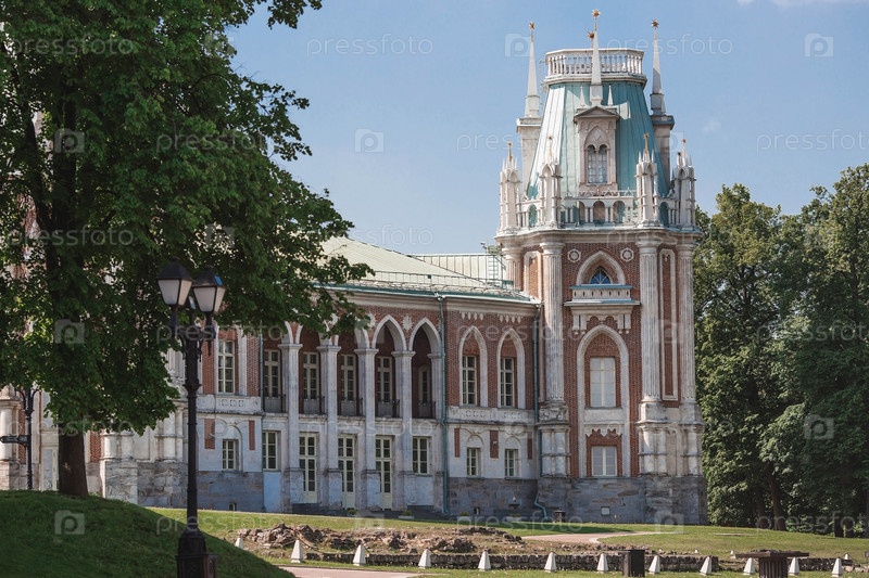 Россия. Большой дворец в Царицынском парке. Царицынский парк — одна из главных туристических достопримечательностей Москвы. Красивый живописный вид на старый вход в комплекс летом в солнечный день