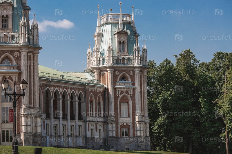 Россия. Большой дворец в Царицынском парке. Царицынский парк — одна из главных туристических достопримечательностей Москвы. Красивый живописный вид на старый вход в комплекс летом в солнечный день
