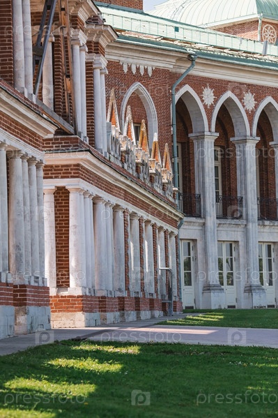 Россия. Большой дворец в Царицынском парке. Царицынский парк — одна из главных туристических достопримечательностей Москвы. Детали дворца. Крупный план