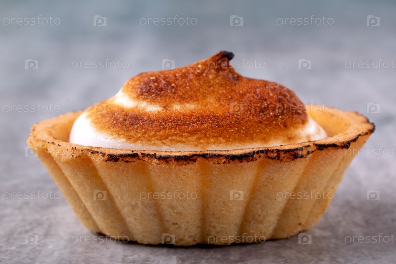 Карамелизированное итальянское безе в песочном тарталетке на сером столе. Взбитый десерт. Крупный план