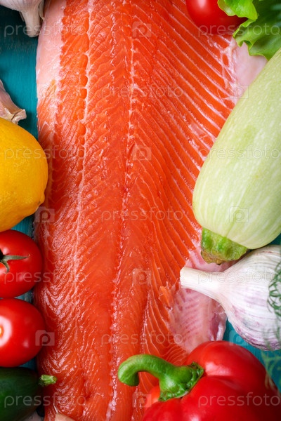 Филе сырой форели и овощи. Ингредиенты для приготовления блюда с красной рыбой. Вид сверху