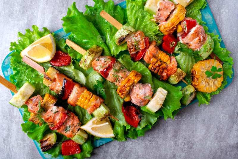 Шашлычки из форели на гриле с кукурузой, цукини и перцем, подаются на листьях салата. Горячее блюдо из красной рыбы. Вид сверху