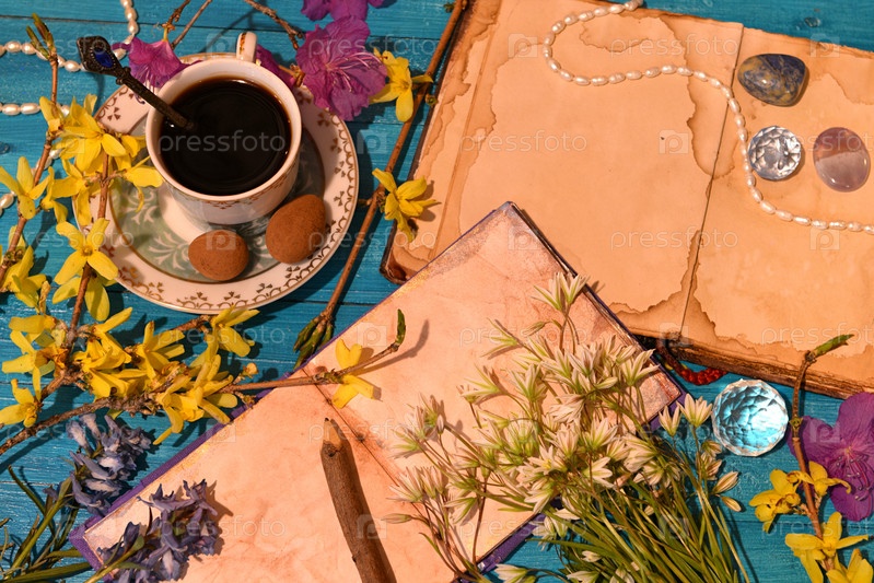 Старая чашка с шоколадными конфетами, кристаллами и открытыми книгами. Оккультный, эзотерический и гадальный натюрморт. Мистический фон со старинными предметами