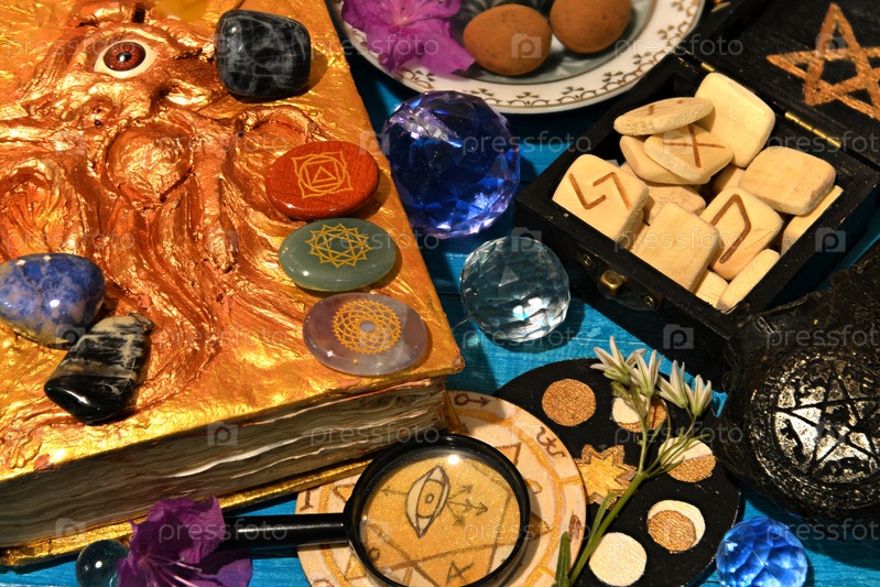 Чакры, руны и волшебная книга заклинаний на алтарном столе ведьм. Оккультный, эзотерический и гадальный натюрморт. Мистический фон со старинными предметами