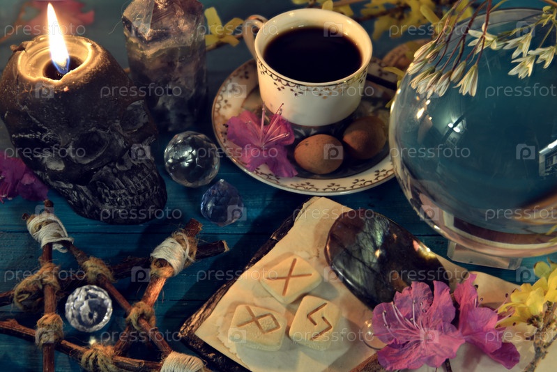 Волшебный хрустальный шар, свеча черепа и руны на алтарном ритуальном столе. Оккультный, эзотерический и гадальный натюрморт. Мистический фон со старинными предметами