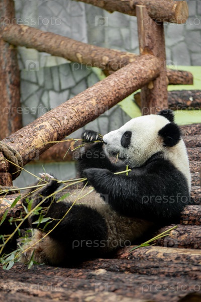 Милая гигантская панда ест бамбук в зоопарке