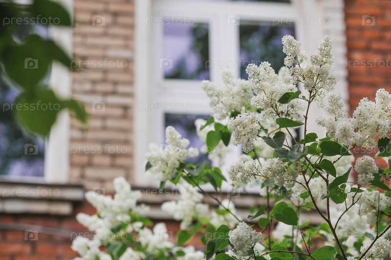 Пушистая, цветущая сирень у дома под окном. Красивый цветочный фон. Крупные гроздья сирени