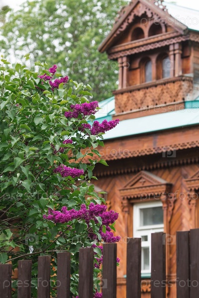 Пушистая, цветущая яркая сирень у старинного русского деревянного дома под окном. Красивый цветочный фон. Крупные гроздья сирени