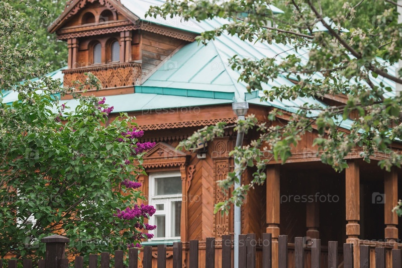 Пушистая, цветущая яркая сирень у старинного русского деревянного дома под окном. Красивый цветочный фон. Крупные гроздья сирени