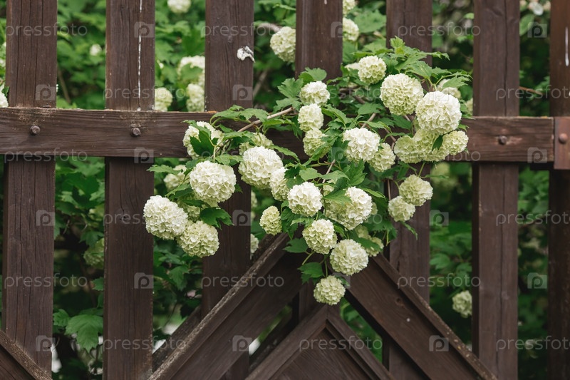 Декоративная калина Бульденеж или Снежный шар (лат. Viburnum opulus var sterile) на фоне забора деревенского дома Россия, Москва, май 2023 г