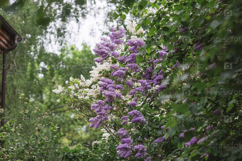 Пушистая, цветущая сирень у дома под окном. Красивый цветочный фон. Крупные гроздья сирени