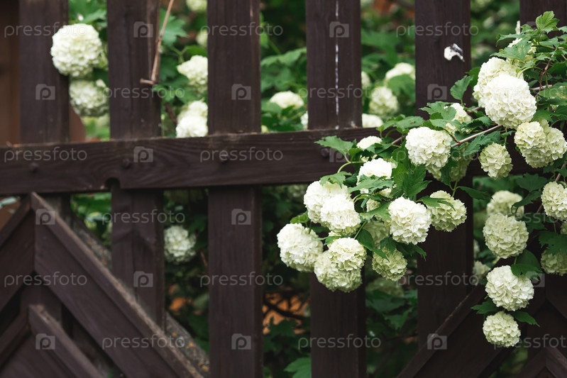 Декоративная калина Бульденеж или Снежный шар (лат. Viburnum opulus var sterile) на фоне забора деревенского дома Россия, Москва, май 2023 г
