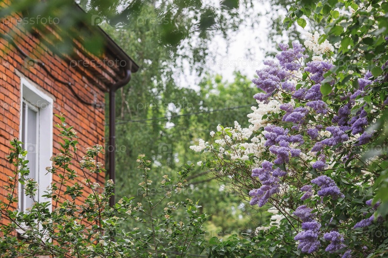 Пушистая, цветущая сирень у дома под окном. Красивый цветочный фон. Крупные гроздья сирени