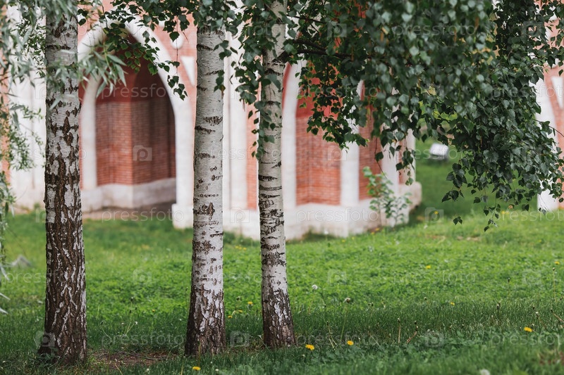 Русская природа и культура. Красивый фон стволов березы, текстура дерева. Береза с цветущими листьями ранней весной